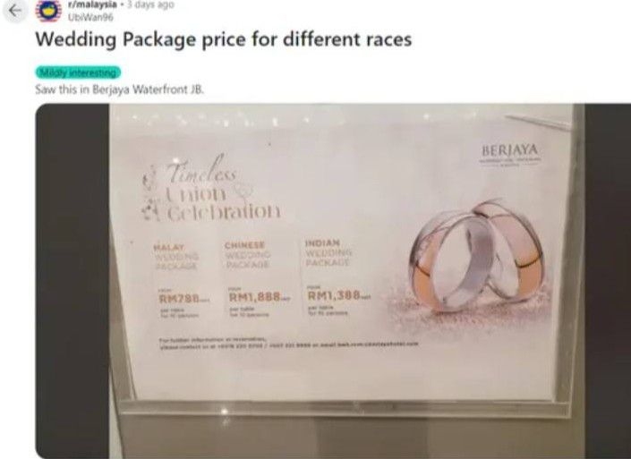 Poster tersebut memperlihatkan nama hotelnya yaitu Hotel Berjaya Waterfront di Johor Bahru. Masalahnya, paket pernikahan yang diberikan punya harga lebih tinggi, khususnya ras India dan China.