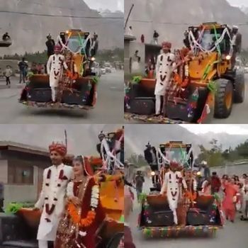 Viral pasangan pengantin asal Pakistan yang melakukan arak-arakan dengan buldoser (via twitter.com)