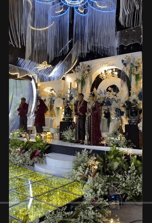 Tampak pelaminan dengan hiasan bunga berwarna biru dan marun masih berdiri, meski kain dekorasi di bagian atap sudah terlepas dan beterbangan. Dalam beberapa foto, pasangan pengantin yang mengenakan busana adat Jawa tampak tetap berada di pelaminan, berusaha tenang di tengah situasi yang kacau.