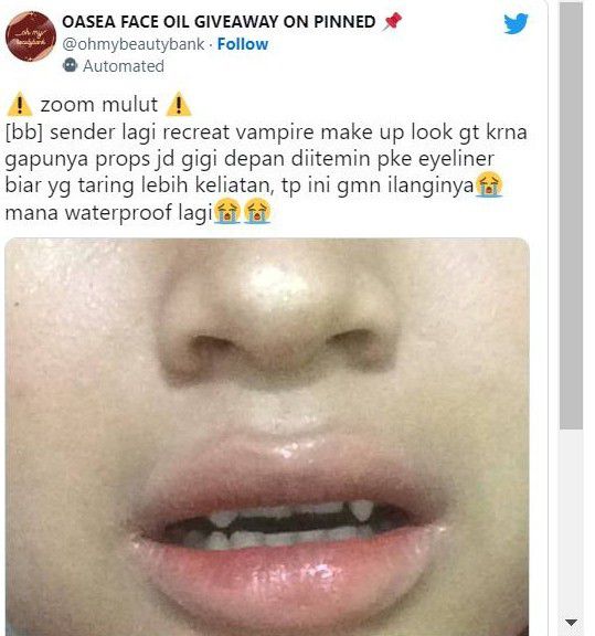 "Sender lagi recreate vampire make up look gitu, karena nggak punya props jadi gigi depan diitemin pakai eyeliner biar yang taring lebih kelihatan, tapi ini gimana hilanginya? Mana waterproof lagi," tulis wanita ini dalam cuitan tersebut.