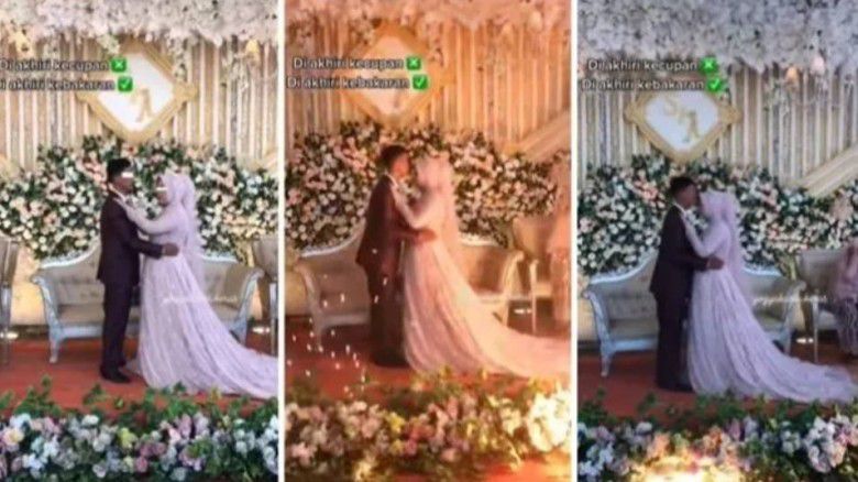 Tapi, momen yang seharusnya romantis dan penuh kehangatan malah berujung panik. Sebab, salah satu kembang api yang dinyalakan malah mengenai dekorasi bunga pelaminan hingga hampir terbakar.