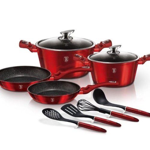 Dalam satu set panci dan Berlinger Haus burgundy metalik, kamu akan mendapat 10 produk, yaitu frypan dua ukuran, casserole pan dua ukuran dilengkapi tutup kaca, spatula, whisk, spatula saringan, dan spatula sop.