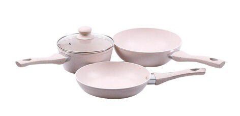 Set wajan dan panci aesthetic dari lain datang dari BOLDe dengan set BOLDe Tri Super Pan yang merupakan peralatan masak anti lengket dengan lapisan granit. Ada banyak warna yang ditawarkan untuk kamu pecinta peralatan masak aesthetic, diantaranya warna pink dan ungu.