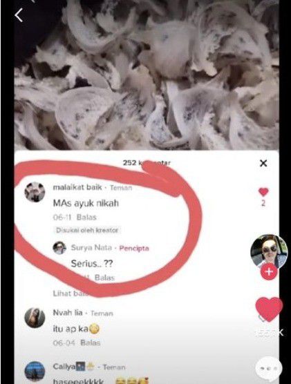 Dalam screenshot-nya, terlihat seorang wanita mengajak dirinya untuk menikah. "Mas ayuk nikah," kata akun TikTok @Malaikat Baik. "Serius ??" jawab @suryanata09.