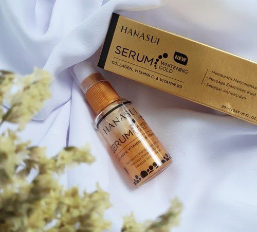 Hanasui Whitening Gold Serum mengandung niacinamide, vitamin C, dan gliserin, yang ampuh mencerahkan, melembutkan, menjaga elastisitas kulit wajah, serta berperan sebagai antioksidan. Serum dengan kemasan berwarna emas ini bertekstur cair sehingga mudah terserap kulit dan tidak terasa lengket.