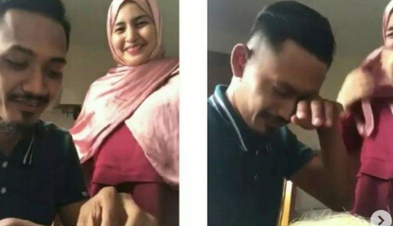 Suaminya pun tak bisa menahan air matanya dan ikut menangis saat melihat isi kadonya. Dari keterangan pengunggah, pasutri tersebut telah menanti kehadiran sang buah hati selama 5 tahun lamanya.