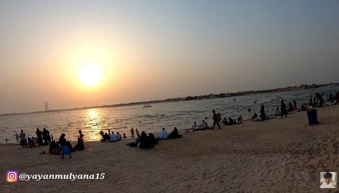 "Nah seperti inilah situasi dan kondisi pantai yang ada di Jeddah, Arab Saudi perempuannya MashaAllah serba tertutup tidak ada yang membuka aurat atau yang namanya pake bikini," beber Alman.