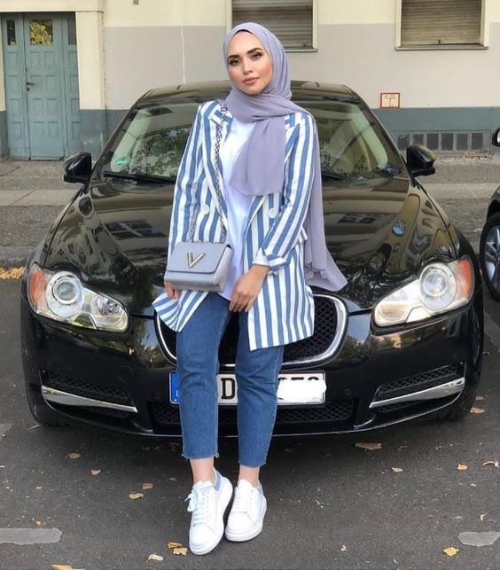 Bergaya casual maksimal seperti gambar diatas bisa membuatmu nyaman. Selain karena perpaduan potongan pakaiannya yang nggak terlalu ribet, kamu juga nggak ditelan tren. Artinya, tetap bisa tampil kekinian dengan perpaduan stripe blazer, celana jeans, sneakers dan hijab.