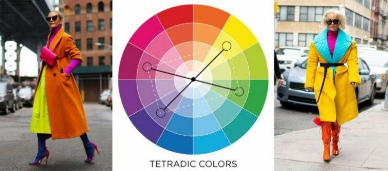 Kombinasi ini memadukan 4 warna sekaligus dalam satu tampilan. Bagi kamu yang menyukai permainan warna, bisa mencoba kombinasi ini. Cara memilih warnanya adalah, dengan membentuk pola persegi panjang dalam diagram warna.