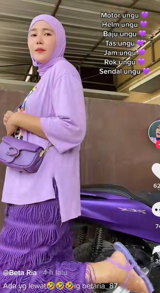 Bahkan, ia sering membagikan konten di TikTok dan memperlihatkan segala barang-barang pribadinya yang berwarna ungu termasuk motor, kacamata, pakaian, tas dan sebagainya.