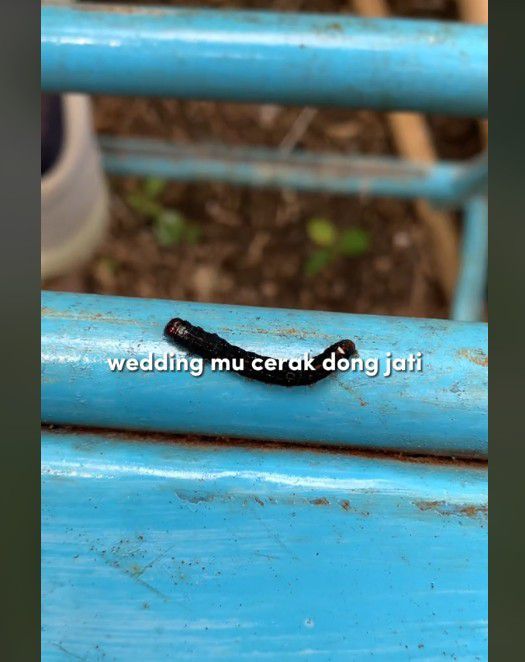 Sang pengunggah memperlihatkan suasana pernikahan yang punya konsep bernuansa alam, namun lokasinya di tengah hutan dan ditemui banyak ulat pohon yang menempel di baju para tamu.