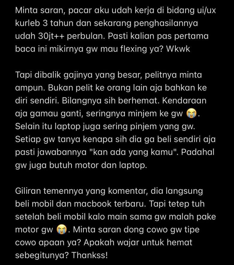"Tapi di balik gajinya yang besar, pelitnya minta ampun. Bukan pelit ke orang lain aja, bahkan ke diri sendiri. Bilangnya sih berhemat. Kendaraan aja ga mau ganti, seringnya minjem ke gw. Setiap gw taanyaa kenapa sih gaa beli sendiri aja, pasti jawabannya ‘kan ada kamu’. Padahal gw juga butuh motor dan laptop," curhat cewek itu.