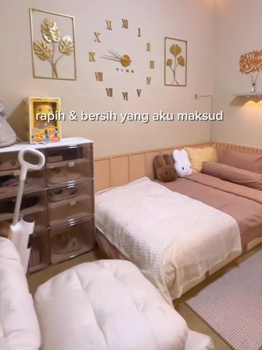 Selain menata dekorasi yang lucu, ia juga menata rapi kamarnya sedemikian rupa. Semua barangnya disusun di tempatnya masing-masing menggunakan laci-laci transparan hingga adanya rak gantung yang terorganisir.