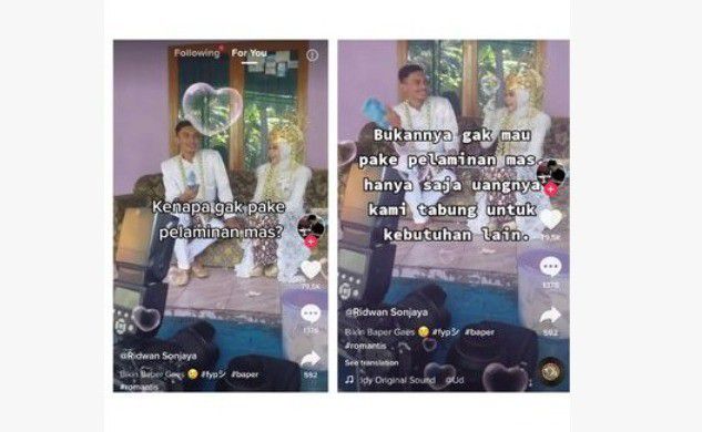 "Bikin baper gaes. Pasangan pengantin ini bikin saya terharu. Pas saya tanya, kenapa gak pake pelaminan mas? Bukannya gak mau pake pelaminan mas. Hanya saja uangnya kami tabung untuk kebutuhan lain," tulis akun TikTok @ridwansonjaya2 (7/4/2021).