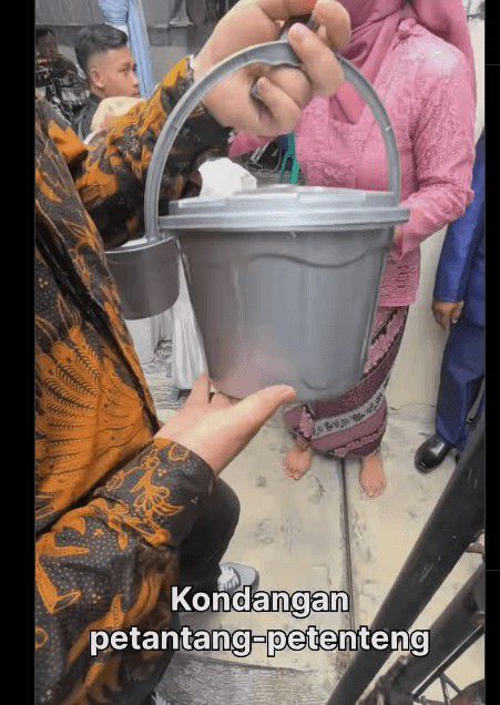 Souvenir pernikahan yang diberikan sepasang pengantin ini sukses menarik perhatian warganet karena tak biasa. Jika umumnya tamu menerima suvenir mungil seperti kipas atau gelas, kali ini para tamu justru pulang membawa ember berisi makanan.
