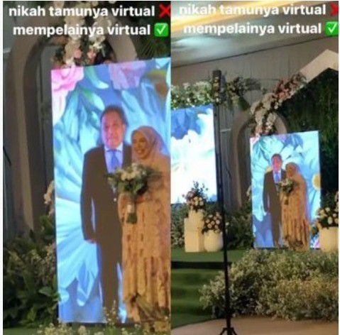 Heboh pengantin wanita yang berada di pelaminan sendirian, sedangkan calon suaminya muncul di layar virtual (via detik.com)