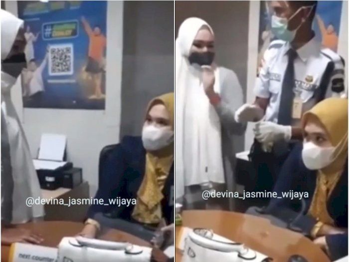Dalam video berdurasi 7 menit itu, tampak seorang wanita berjilbab abu-abu sedang bersama 4 orang anak yang menghampiri seorang karyawan bank di meja kerjanya.