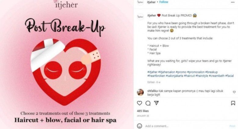 "Untukmu yang sedang mengalami fase patah hati, jangan sedih! ItjeHer siap memberikan penawaran terbaik untuk membuat si dia menyesal," tulis keterangan dalam akun Instagram salon tersebut.