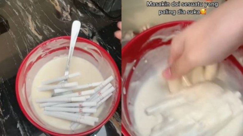 Sebuah video TikTok viral ketika seorang wanita sengaja memasak rokok goreng tepung untuk kekasihnya. Di video itu, tampak beberapa puntung rokok dimasukkan ke dalam adonan tepung terigu yang sudah diberi air.