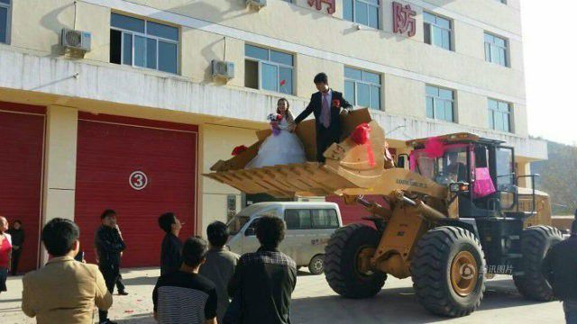 Pengantin asal Tiongkok ini mengaku tidak ingin pernikahan mereka biasa-biasa saja. Karena itu, mereka meminta teman-temannya untuk mengumpulkan buldozer sebagai mobil pengantin di hari pernikahan.