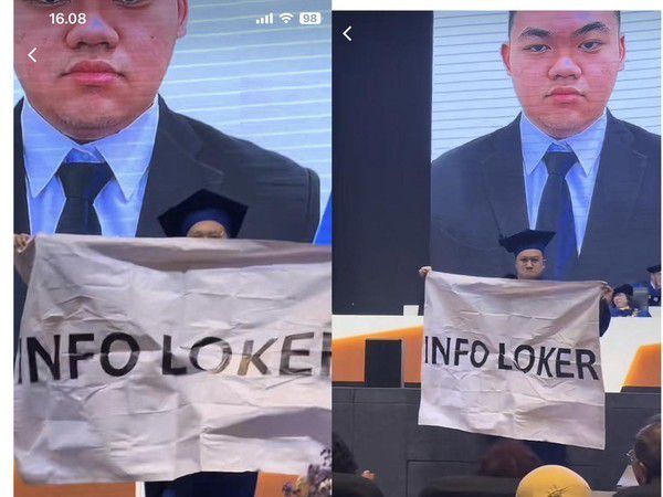 Viral mahasiswa bawa spanduk 'info loker' saat wisuda (via tiktok)