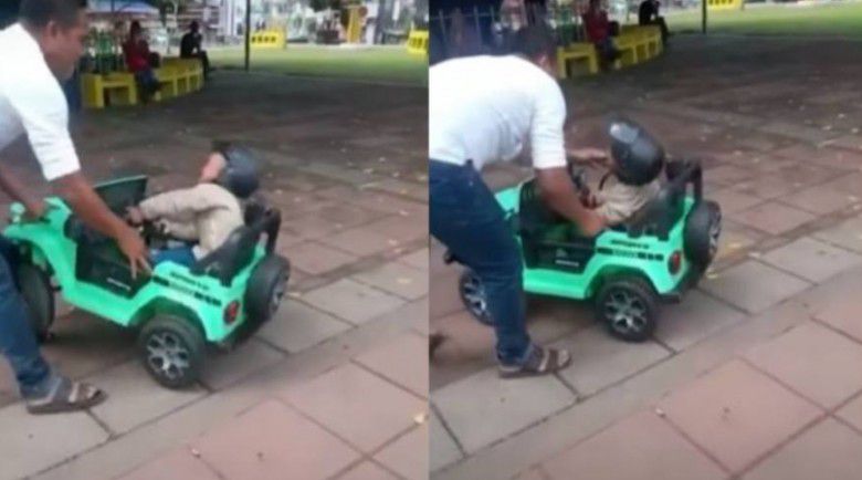 Dari video singkat itu, tampak seorang bocah laki-laki sedang mengendarai mobil mainan berukuran kecil.