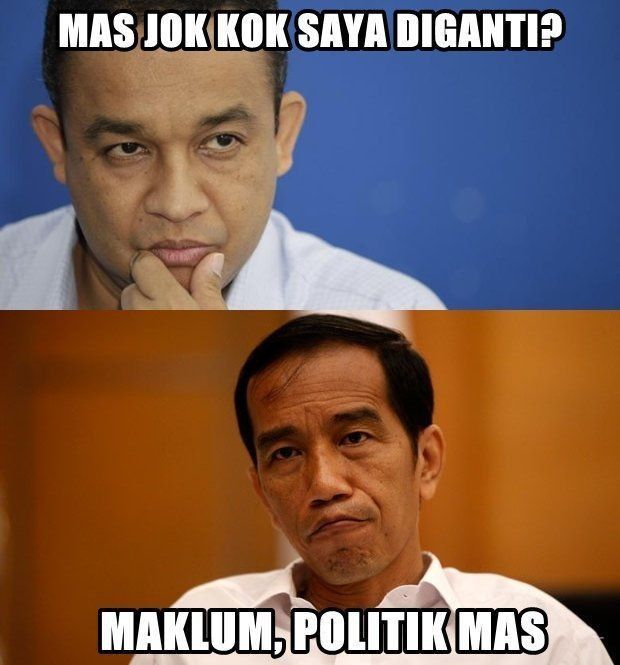 Meme berikut ini menggambarkan pertanyaan Anies Baswedan kepada Jokowi. Anies memang pernah menjadi Menteri Pendidikan dan Kebudayaan namun akhirnya digantikan. Dalam meme ini, Anies yang kini jadi Gubernur DKI Jakarta bertanya kepada Jokowi, kenapa dirinya diganti orang lain. “Maklum politik mas,” jawab Jokowi.