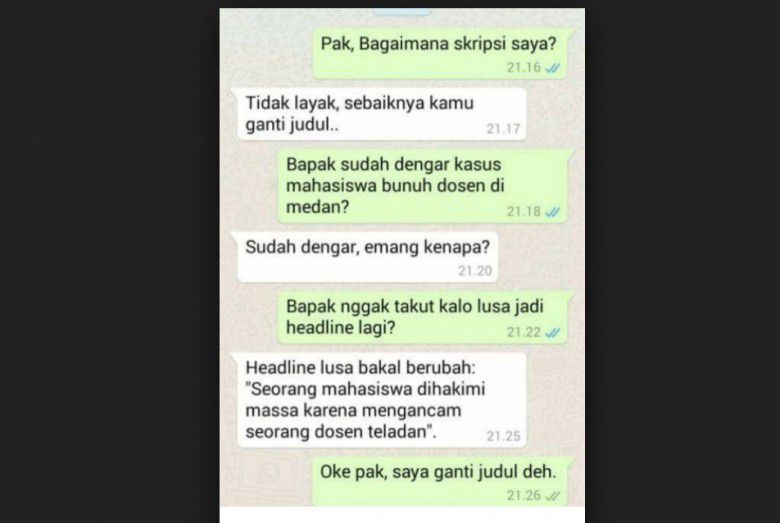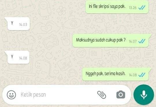 Dosen yang satu ini sepertinya orang yang tak suka menulis panjang di chat. Dia jawab seadanya, cuma satu huruf saja. Tapi meski cuma singkat yang penting kan dibalas.