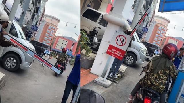 Dari video tersebut, tampak seorang pria yang sedang memegangi palang pintu parkir dan membuka tutupnya secara manual.