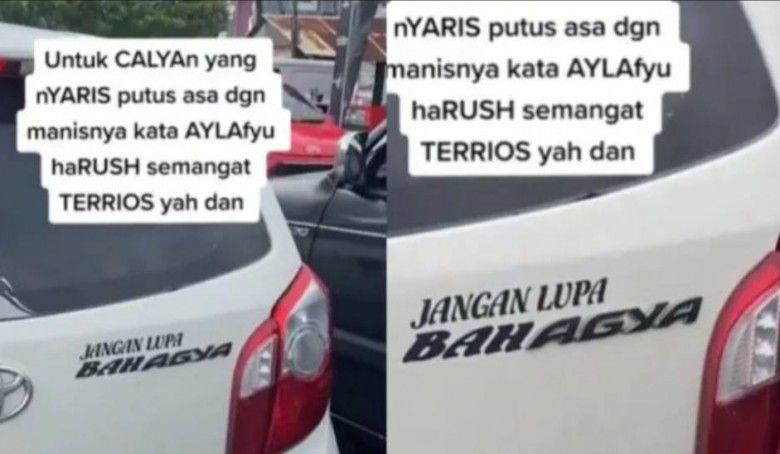 Ternyata, mobil Toyota Agya itu kini memiliki sebuah kalimat panjang yang membuat para pengendara lain ikut tertawa. Kalimat tersebut memang ditujukan supaya pengendara lain ikut merasa bahagia.