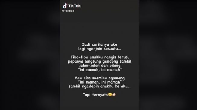 "Jadi ceritanya aku lagi ngerjain sesuatu, tiba-tiba anakku nangis terus, papanya langsung gendong sambi jalan-jalan dan bilang, 'ini mamah, ini mamah'. Aku kira suamiku ngomong 'ini mamah, ini mamah' sambil ngadepin anakku ke aku. Tapi ternyata..." tulis pemilik akun dalam keterangannya.