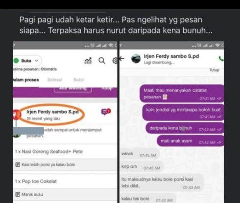 “Pagi pagi udah ketar ketir…Pas ngelihat yang pesan siapa. Terpaksa harus nurut daripada kena bunuh,” tulis caption tersebut. Yang jelas driver ojol itu menyangka sosok orang yang memesan makanan tersebut benar-benar Sambo yang diketahui sudah jadi tersangka dalam kasus dugaan pembunuhan berencana terhadap Brigadir J.