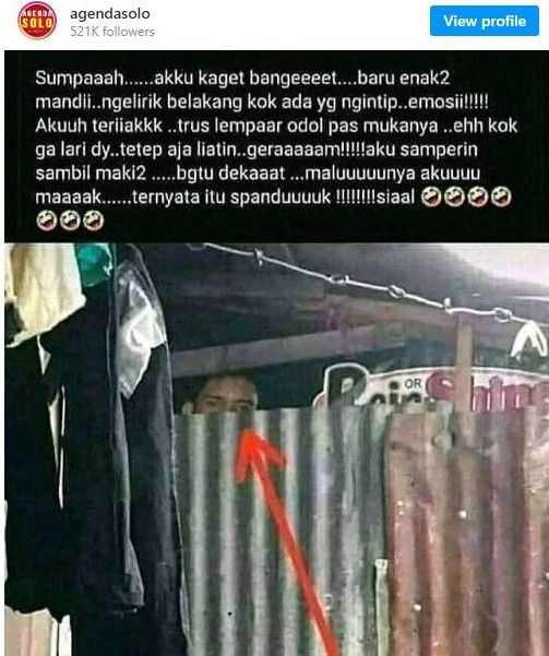 "Sumpah aku kaget banget. Baru enak-enak-enak mandi, ngelirik ke belakang kok ada yang ngintip. Emosi," tulis kisah tersebut.