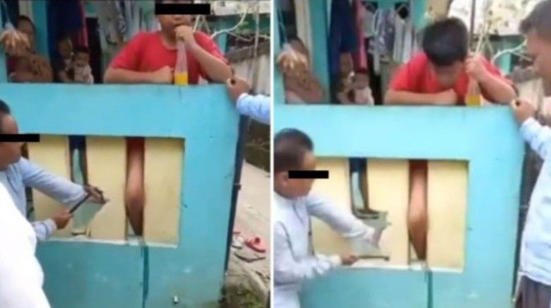 Dari video itu, tampak seorang bapak-bapak berusaha untuk menghancurkan pagar tembok yang menjepit kaki sang bocah tersebut karena tak bisa keluar.