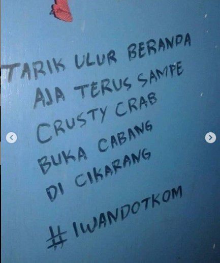 Wkwkwkw, tarik ulur beranda emang sebuah kebiasaan anak-anak zaman now di negara +62 ini, jadi emang kata-kata lucu menyindir. Lagian Crusty Crab masak iya disuruh buka cabang di cikarang sih, ngaco wkwkw.