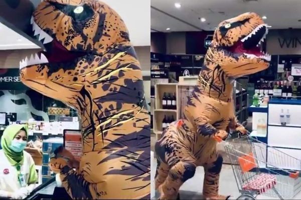 Awas ada T-Rex di pusat perbelanjaan, tapi ini bukan dinosaurus sungguhan kok melainkan costum untuk menghindari corona, katanya....