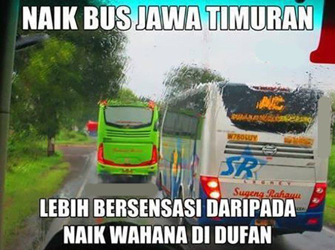 Dunia Fantasi atau Dufan di Jakarta memiliki banyak wahana bagi pengunjung. Nah, ada juga nih meme yang membandingkan penumpang naik bus malam di Jawa Timur dengan wahana - wahana di Dufan yang juga memiliki tingkat berbahaya karena menegangkan. Apakah bus malam di Jawa Timur dan wahana Dufan sama-sama membuat jantung berdegup kencang?