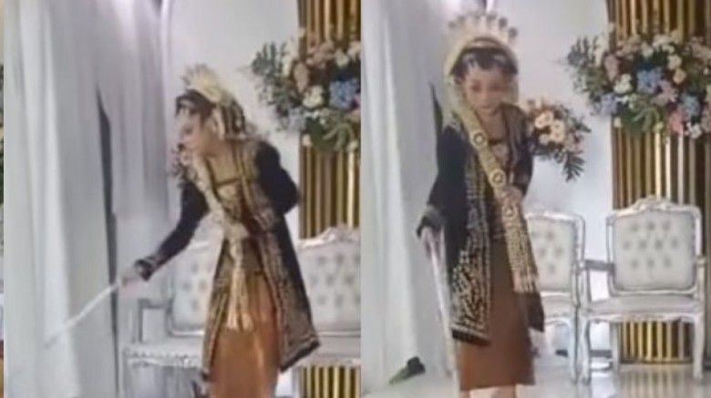 Sambil mengenakan sepatu heels, sang pengantin malah tak ragu menyapu pelaminannya sendiri yang menurutnya kotor.