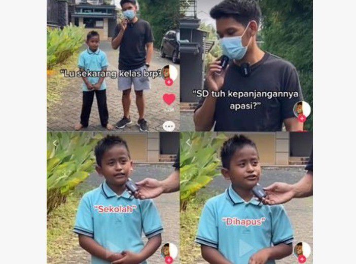 Lalu video berikutnya, Ben kembali meminta bocah tersebut buat menjawab apa singkatan dari SD. "Lu sekarang kelas berapa?" tanyanya."Satu," jawab bocah kaus biru."SD itu kepanjangannya apa sih?" tanya Ben."Sekolah Dihapus," jawab bocah itu.