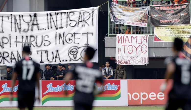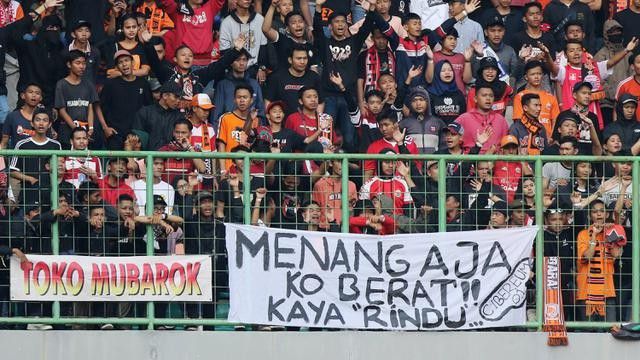 Spanduk ini bertuliskan "menang aja ko berat kayak rindu". Jangan-jangan suporter yang menuliskan spanduk adalan Dilan. Karena si panglima geng motor itu memang sering mengucapkan kalimat seperti tulisan di spanduk.