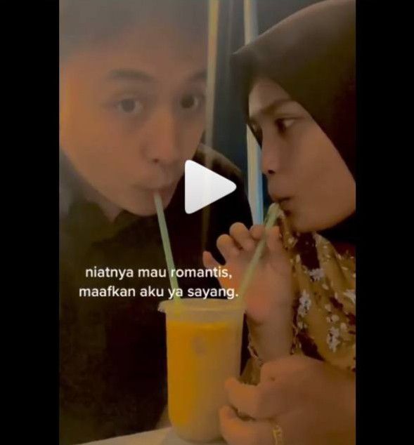 Sebuah video yang diunggah melalui akun Instagram @dagelan memperlihatkan pasangan yang sedang asik melakukan hal romantis yakni dengan minum satu gelas berdua.