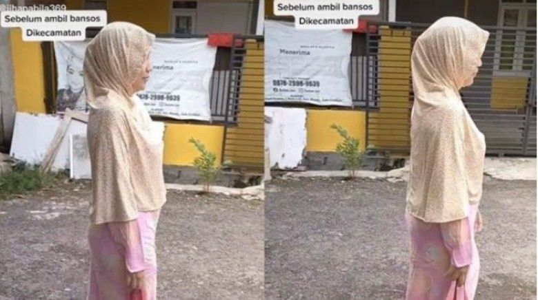 Seorang ibu-ibu viral di media sosial karena memeragakan perubahan gaya seseorang sebelum dan sesudah menerima bantuan sosial (bansos).
