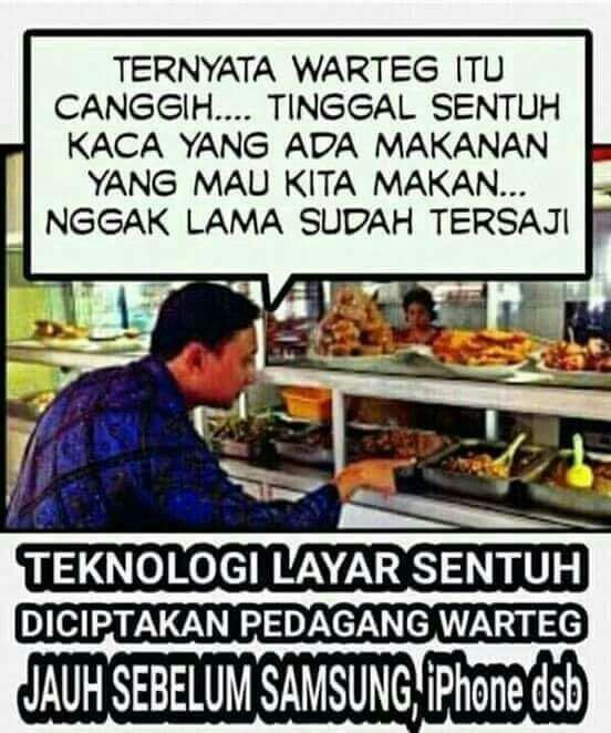 Banyak candaan yang menyebut jika warteg adalah rumah makan pertama yang menggunakan teknologi touchscreen. Memang pembeli biasanya menunjuk makanan menggunakan jari yang disentuh di kotak kaca. Dari pilihan itu maka pelayan wartag akan mengambilkan untuknya.