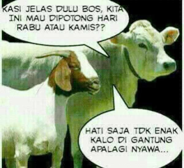 Si sapi ngomong, "Kasi jelas dulu bos, kita ini mau dipotong hari Rabu atau Kamis?" Eh, kemudian si kambing juga bilang, "Hati saja tidak enak kalo di gantung, apalagi nyawa..." kan bikin ngakak banget tuh wkwkwkwkw. Kece nih di save ke galeri handphone kamu.