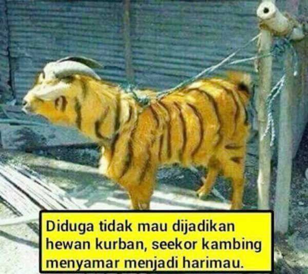 Kocak banget emang gambar ini. Entah idenya siapa warnain kambing jadi kuning unik dan di kasih belang yang mirip dengan macan. Sontak gambar ini bikin ngakak, apalagi ada keterangan gambarnya "Diduga tidak mau dijadikan hewan kurban, seekor kambing menyamar menjadi harimau."