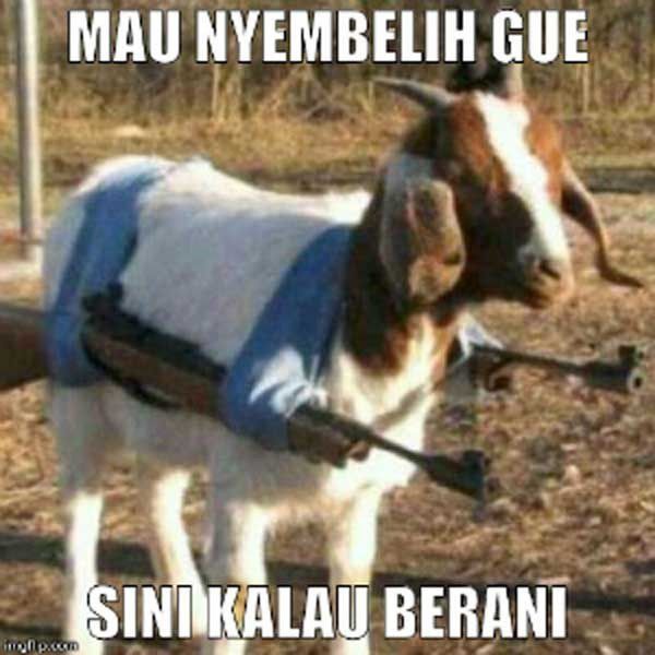 Gambar kambing ini bikin ngakak, lantaran si kambing diberi dua senapan di bagian kanan dan kirinya. Ditambah dengan kekocakan tulisan meme "MAU NYEMBELIH GUE, SINI KALAU BERANI" pas banget deh, kocak banget.