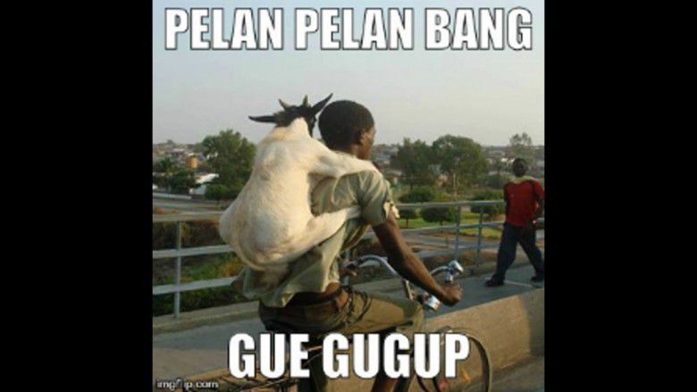 Gambar meme ini sontak bikin yang lihat ketawa. Lantaran Si kambing yang seolah memeluk manusia yang mengandarai sepeda. Ditambah dengan tulisan meme "PELAN PELAN BANG, GUE GUGUP" menambah kekocakan gambar tersebut.