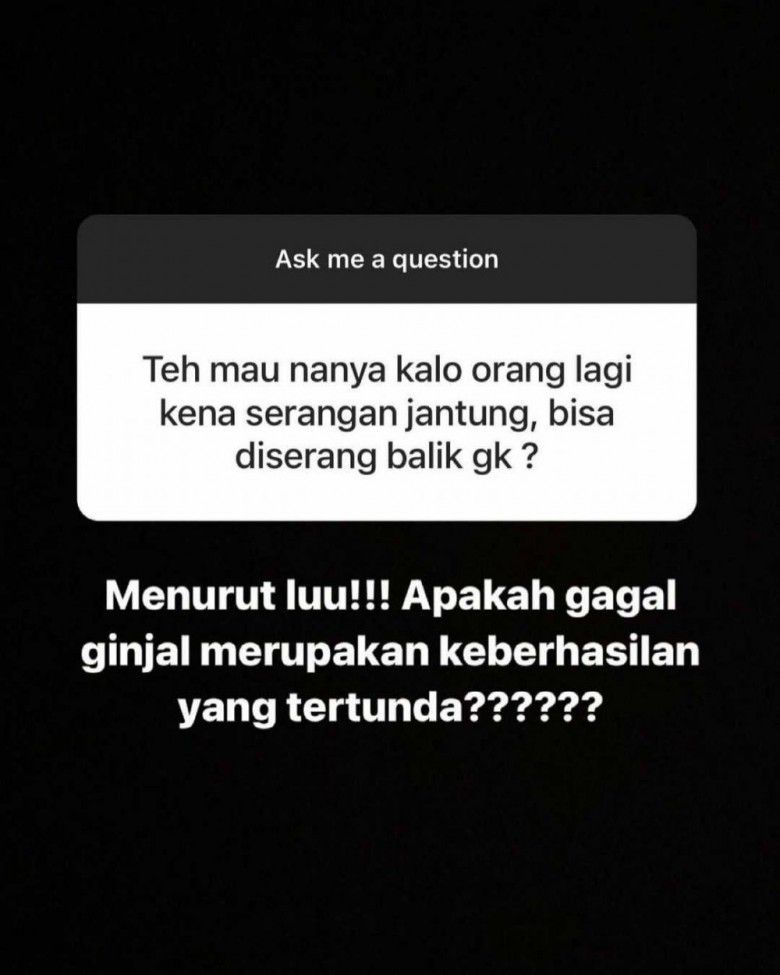 Melempar pertanyaan di instagram memang menjadi salah satu tren yang dilakukan banyak orang, termasuk para publik figur. Baru-baru ini, Rina Nose membuat QnA di instagramnya yang mengundang banyak respon dari netizen. Tak jarang, ada saja pertanyaan-pertanyaan absurd yang muncul. Sontak pertanyaan-pertanyaan ngaco tersebut bikin sang pemilik aku naik darah. Penasaran seperti apa? Yuk, lihat kumpulan QnA di instagram Rina Nose berikut ini!