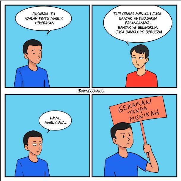 Menurut banyak pendapat, memang pacaran itu pintu kemaksiatan, dan punya potensi kekerasan di dalamnya. Lalu si pemuda berbaju orange maparin, kalo nikah juga banyak yang cerai karena faktor KDRT (Kekerasan Dalam Rumah Tangga).