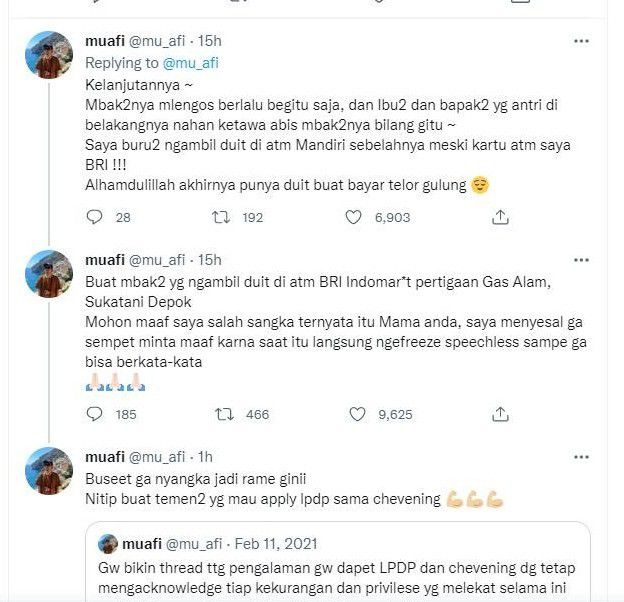Mendengar hal itu, Muafi langsung membeku dan tak mampu mengucapkan permintaan maaf. Bahkan, dirinya sempat ditertawakan dengan orang lain yang sedang mengantri di ATM tersebut.
